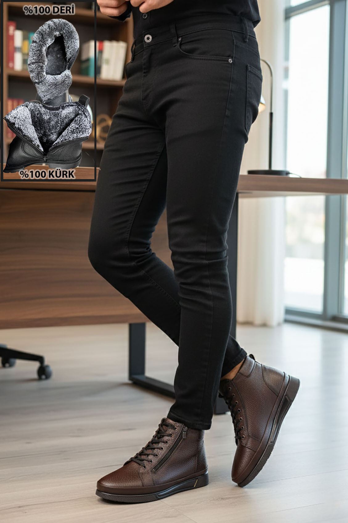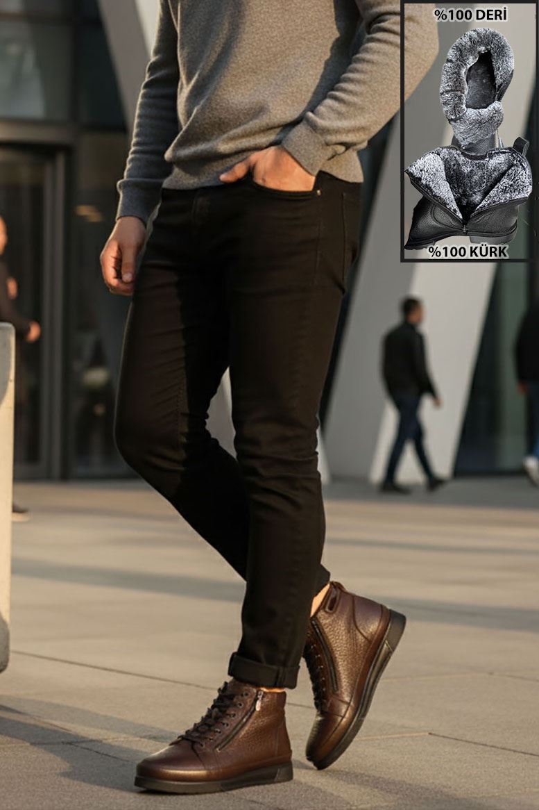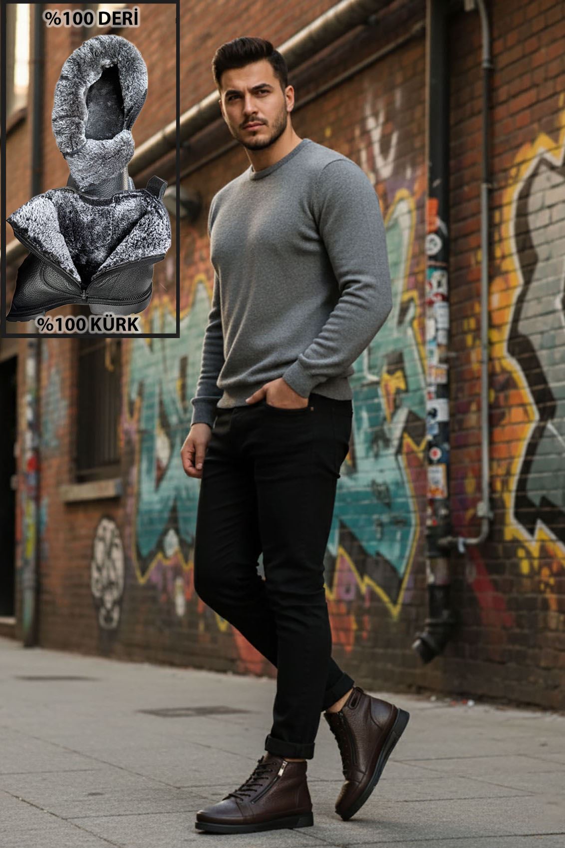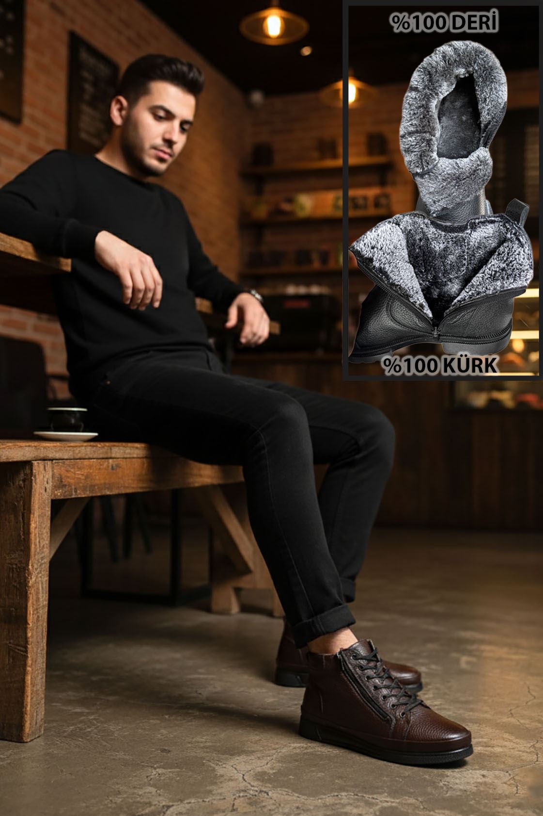 Kahve Fermuarlı İçi Kürklü Hakiki Deri Erkek Bot