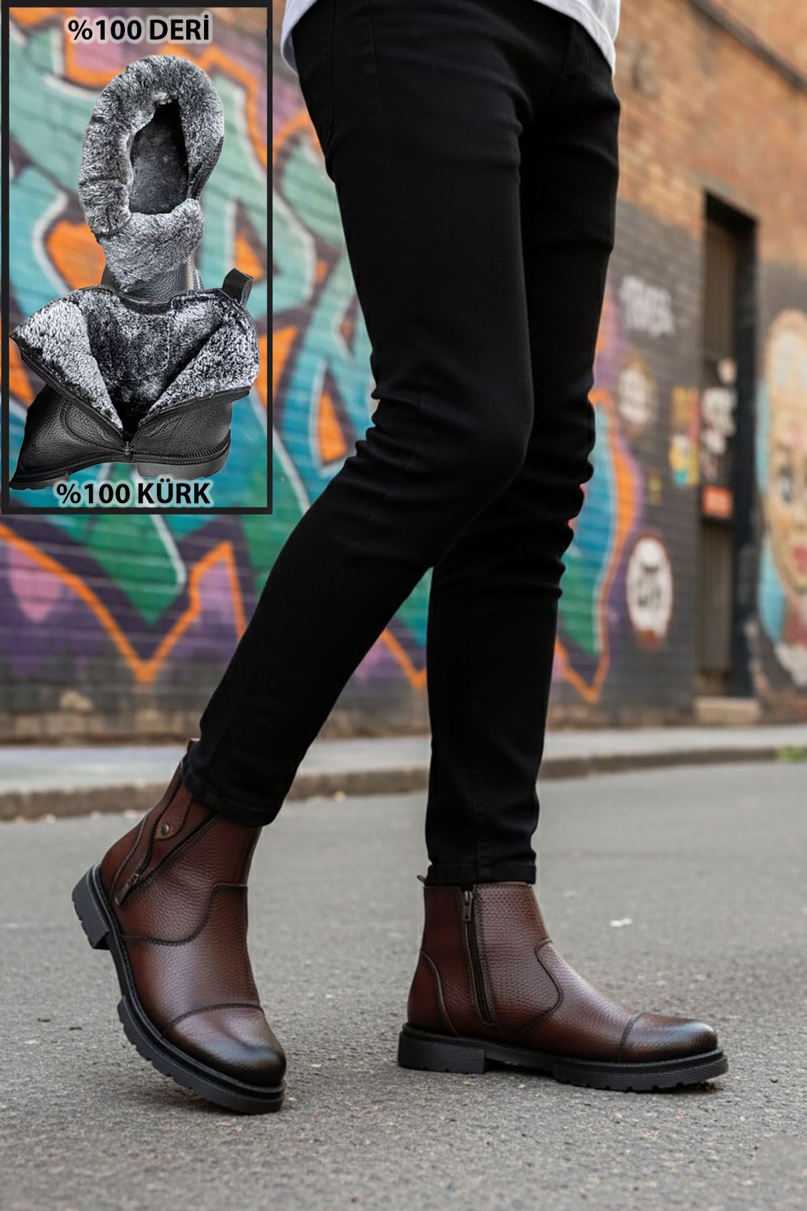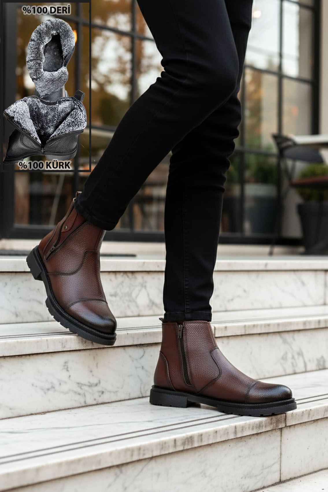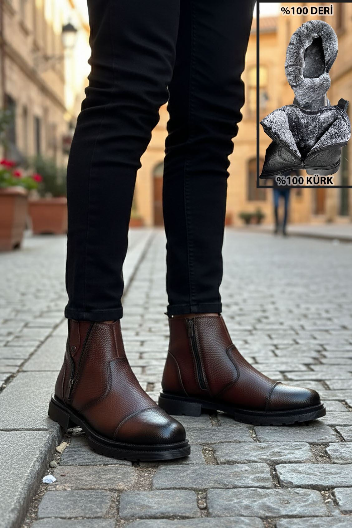 Kahve İçi Kürklü Fermuarlı Chelsea Hakiki Deri Erkek Bot