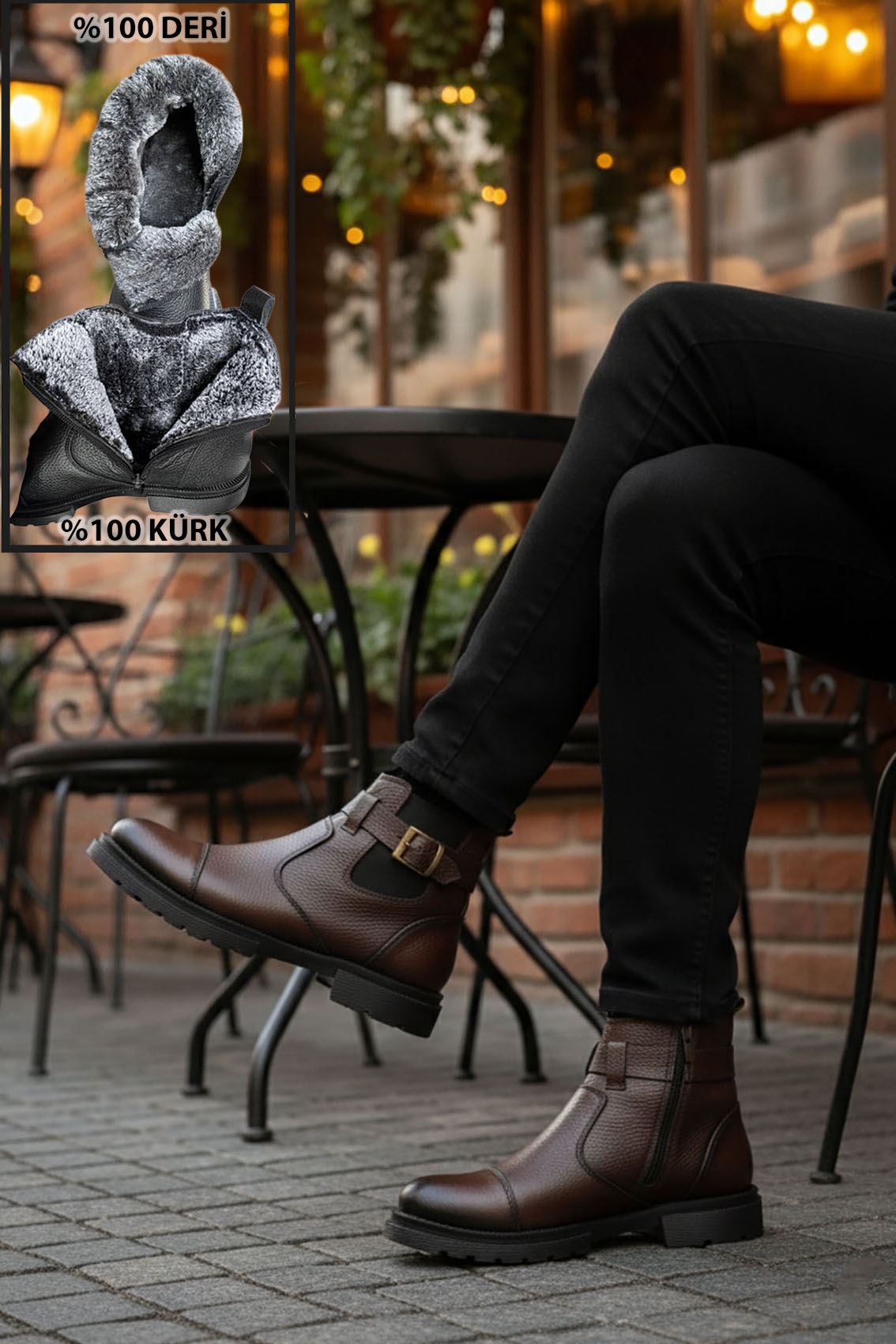 Kahve İçi Kürklü Fermuarlı Hakiki Deri Erkek Bot